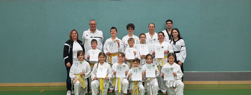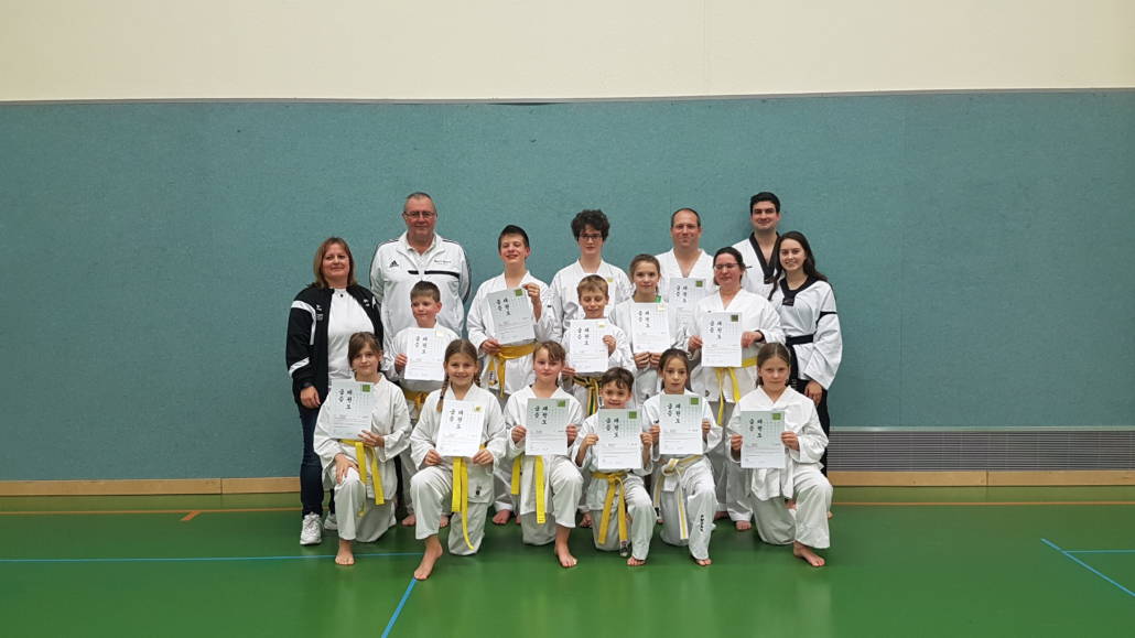 Die Trainer Thomas Fechner und Denise Ruf hatten die Aufgabe 13 Sportler auf die bevorstehende Gürtelprüfung nach der DTU-Prüfungsordnung vorzubereiten. Dann war es endlich soweit, die Prüflinge zeigten der Prüferin Sonja Ruf ihr Können. Alle Sportler haben mit guten bis sehr guten Leistungen die von ihnen verlangten Prüfungsaufgaben gemeistert. Für vier Sportler war es die erste Gürtelprüfung, alle konnten gleich die Prüfung zum 8 Kup (gelber Gürtel) ablegen. Die anderen neun Sportler erhielten die nächsthöhere Graduierung. Die hervorragende Vorbereitung der Trainer Thomas Fechner und Denise Ruf, sowie der Trainingsfleiß der Sportler, wurde durch ein großes Lob von der Prüferin Sonja Ruf gewürdigt. Auch die anwesenden Zuschauer waren begeistert von den Leistungen der Prüflinge.