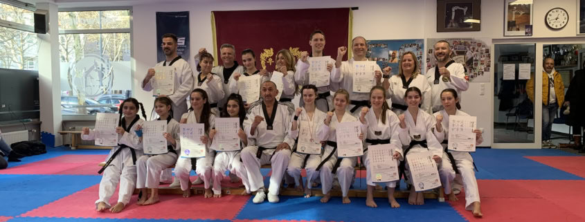Geprüft wurden die TSG Sportler in den verschiedenen Bereichen wie Basics, Formen, Einstepp, Kicks, Kampf und Bruchtest vom Kukkiwon Großmeister Sedat Karaman (8 Dan). Bei den Basics geht es darum die Techniken korrekt, sicher und effektiv auszuführen. In den Formen (Poomsae) wird die richtige Abfolge, Exaktheit der Ausführung, sowie Kraft und Dynamik bewertet. Beim Einstepp geht es um wirkungsvolle Abwehrtechniken in Form von Hand- und Fußtechniken. Der Kampf beinhaltet Schnelligkeit, Technik und Taktik. Beim Bruchtest wird die Durchschlagskraft der erlernten Techniken verlangt. Hier zeigt es sich, ob man einen starken Willen und Vertrauen in seine eigenen Fähigkeiten hat. Die TSG Prüflinge zeigten in allen Bereichen gute bis sehr gute Leistungen. Maja Tepaß war die Prüfungsbeste von insgesamt 16 Prüflingen, die allen bestanden haben.