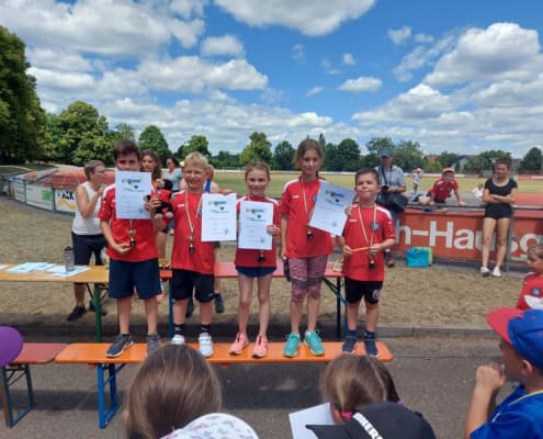 Für Samu Kohn, Fabian Neher, Jane Speich und Toni Drechsler (TSG) sowie Luisa Hudelmaier und Davyd Kasumov (LAC) war es in der U8 zum Teil der allererste Wettkampf – und was für einer! Trotz Aufregung zeigten die Jüngsten, was in ihnen steckt. Mit Ausdauer, Konzentration und Teamgeist kämpften sie sich durch die Disziplinen und erreichten am Ende einen tollen dritten Platz.