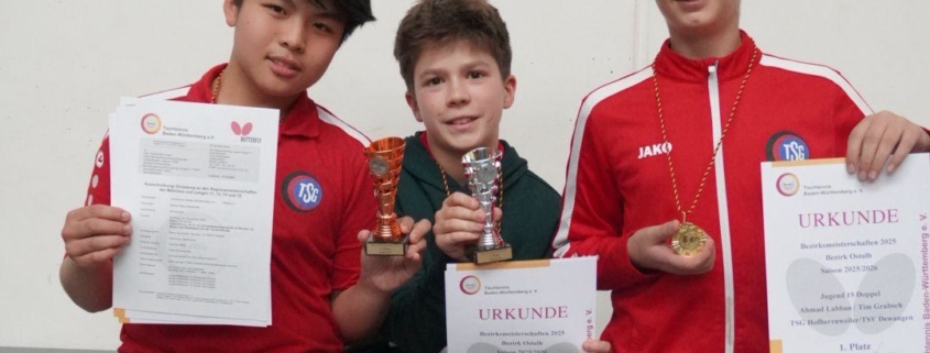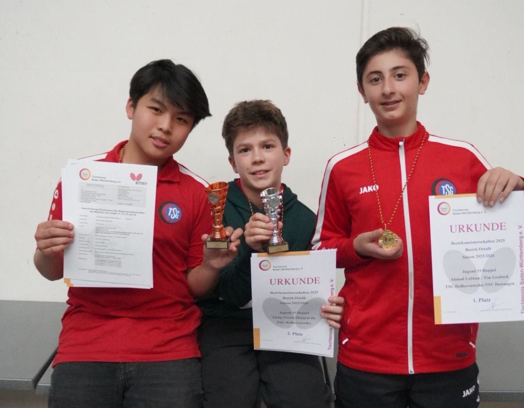 Los ging es am Samstag mit den U15ern. Im Einzel traf Walid in der KO-Runde auf den späteren Bezirksmeister und zugleich seinen Doppelpartner. Trotz großem Kampfgeist musste er sich knapp geschlagen geben. Hongrui erreichte nach einer starken Leistung das Halbfinale, wo er im vereinsinternen Duell auf Philip traf. Dieses entschied Philip für sich, während Hongrui im Spiel um Platz 3 noch einmal alles gab und sich verdient die Bronzemedaille sicherte.